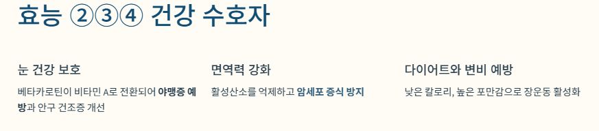 | 베타카로틴 (Beta-carotene) | 강력한 항산화 작용 | 체내 활성산소 제거, 암 예방, 면역력 강화 |