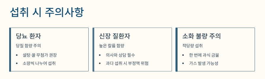- 신장 질환자 주의: 칼륨 함량이 매우 높기 때문에 신장 기능이 저하되어 칼륨 배출이 어려운 분들은 과다 섭취 시 부정맥 등 부작용이 생길 수 있으므로 의사와 상담 후 섭취해야 합니다.
