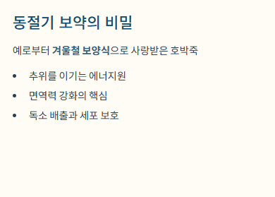 단순히 맛있어서가 아닙니다. 호박죽은 예로부터 '동절기 보약'이라 불릴 정도로 영양학적 가치가 매우 높은 음식입니다. 특히 겨울철 동지에 팥죽과 함께 즐겨 먹었던 호박은 추위를 이겨내고 면역력을 높여주는 훌륭한 에너지원이었죠.