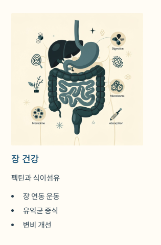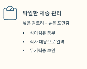| 식이섬유 | 높음 | 장운동 촉진, 포만감 유지, 변비 예방 |