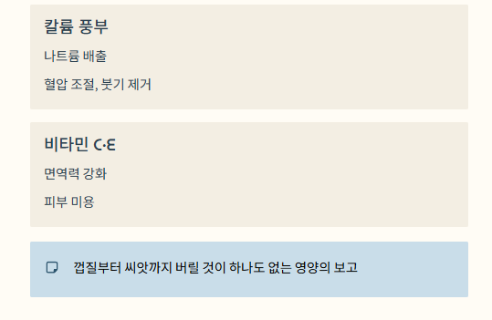 | 칼륨 | 풍부함 | 나트륨 배출, 혈압 조절, 붓기 제거 |