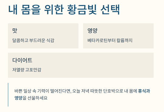 바쁜 일상 속에서 기력이 떨어지거나 몸이 무겁게 느껴진다면, 오늘 저녁엔 따뜻하게 찐 단호박이나 부드러운 단호박 스프 한 그릇으로 내 몸에 휴식과 영양을 선물해 보는 건 어떨까요?