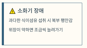 - 소화기 장애: 한꺼번에 너무 많은 식이섬유를 섭취하면 복부 팽만감이나 가스가 발생할 수 있으니 평소 위장이 약한 분들은 조금씩 늘려가는 것이 좋습니다.