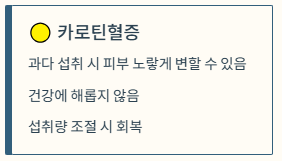 - 카로틴혈증: 단기간에 너무 많이 먹으면 베타카로틴이 피부에 침착되어 손발이 노랗게 보일 수 있습니다. 건강에 해롭지는 않으나 섭취를 조절하면 다시 사라집니다.