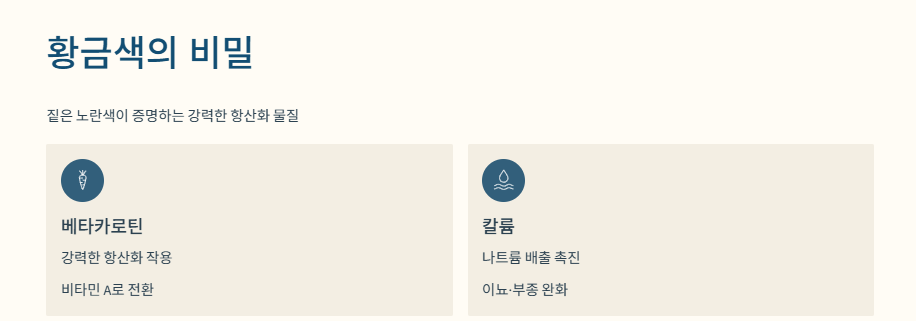 | 베타카로틴 | 강력한 항산화 작용 | 항암 효과, 피부 노화 방지, 면역력 증진 |