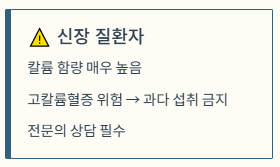 - 신장 질환자 주의: 칼륨 함량이 매우 높습니다. 신장 기능이 약해 칼륨 배출이 어려운 분들은 과다 섭취 시 고칼륨혈증으로 인한 부정맥 위험이 있으니 주의해야 합니다.