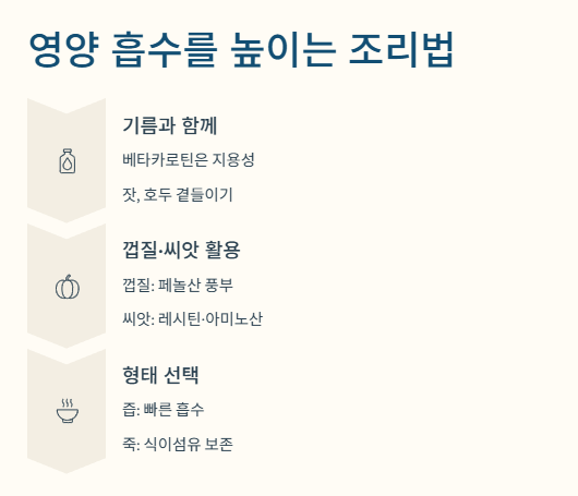 - 기름과 함께 조리하세요: 베타카로틴은 지용성입니다. 호박죽을 드실 때 잣이나 호두를 곁들이거나, 호박전처럼 기름에 조리하면 흡수율이 몇 배로 뜁니다.