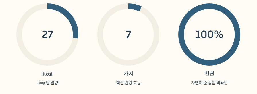 100g당 약 27kcal로 열량이 매우 낮으면서도 수분과 식이섬유가 많아 포만감이 큽니다. 항산화 성분들은 피부의 멜라닌 색소 침착을 막고 세포 노화를 늦춰 맑고 탄력 있는 피부를 가꾸는 데 도움을 줍니다.