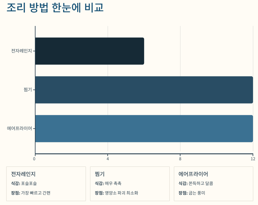 | 찜기/냄비 | 10~15분 | 매우 촉초함 | 영양소 파괴 최소화, 부드러움 |