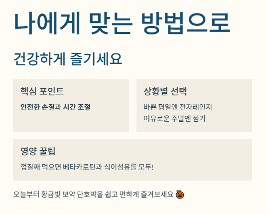 오늘 알려드린 팁으로 딱딱한 단호박과 씨름하지 마시고, 쉽고 편하게 황금빛 보약 단호박을 식탁에 올려보시길 바랍니다.