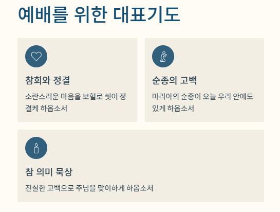 - 순종의 마음을 구하는 기도: "주의 여종이오니 말씀대로 내게 이루어지이다 고백했던 마리아의 순종이 오늘 우리 안에도 있게 하옵소서."