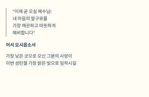 - 성탄의 참 의미를 묵상하는 기도: "화려한 장식보다 우리 영혼의 진실한 고백으로 주님을 맞이하게 하옵소서."