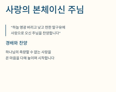 - 경배와 찬양: 하나님의 성품(사랑, 공의, 자비)을 높이며 시작합니다.