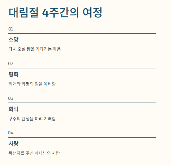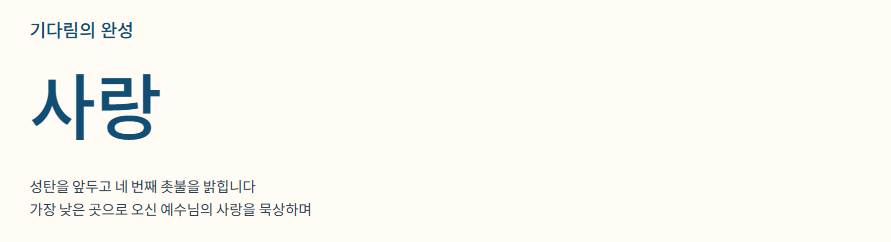 | 주차 | 주제 | 의미 | 촛불의 의미 |