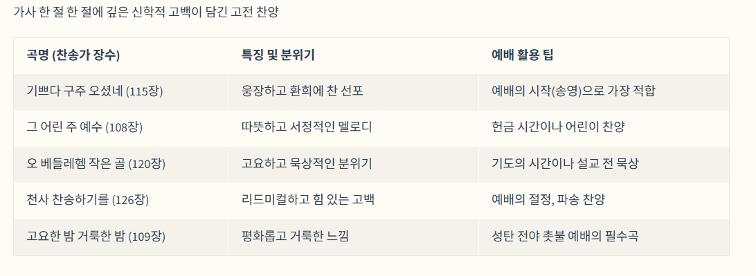 | 고요한 밤 거룩한 밤 (109장) | 평화롭고 거룩한 느낌 | 성탄 전야 촛불 예배의 필수곡 |