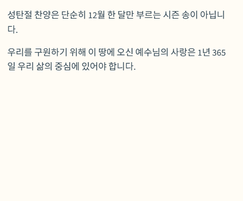 성탄절 찬양은 단순히 12월 한 달만 부르는 시즌 송이 아닙니다. 우리를 구원하기 위해 이 땅에 오신 예수님의 사랑은 1년 365일 우리 삶의 중심에 있어야 하기 때문입니다.