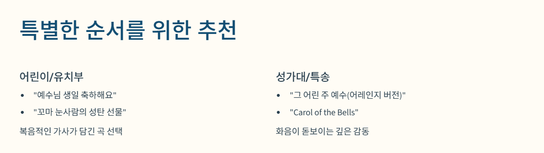 - 추천: "그가 오신 이유", "오 거룩한 밤", "참 반가운 신도여"