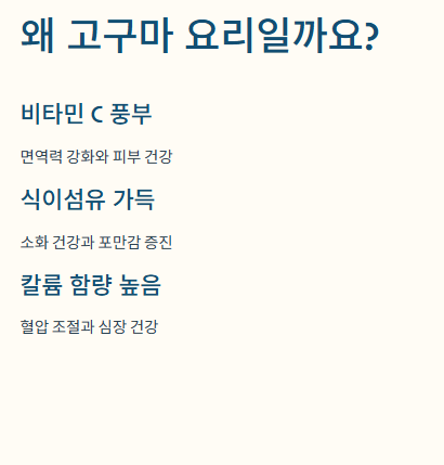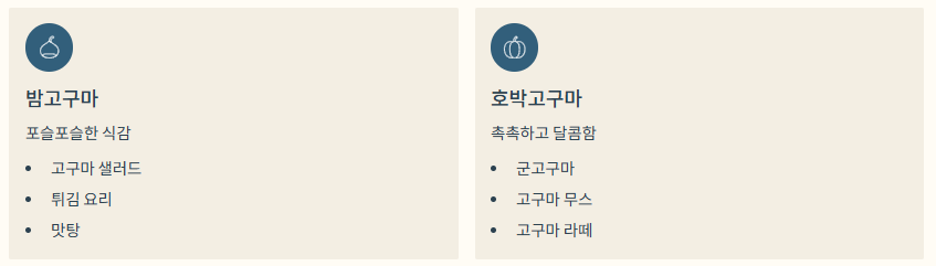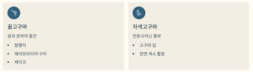 | 호박고구마 | 수분이 많고 말랑하며 매우 달콤함 | 군고구마, 고구마 무스, 고구마 라떼 |