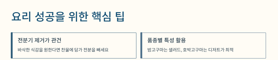 | 밤고구마 | 포슬포슬한 식감, 수분 적음 | 고구마 샐러드, 튀김, 맛탕 |