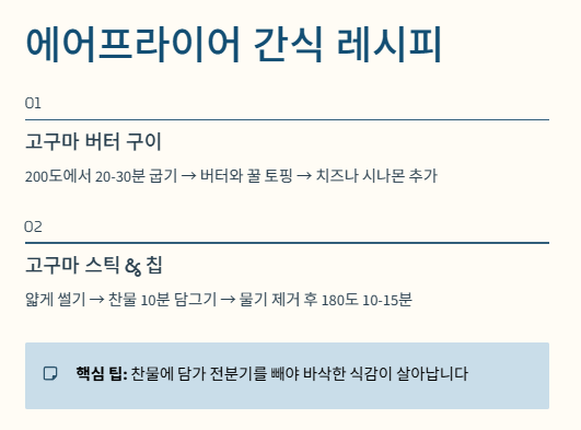 에어프라이어 하나로 뚝딱 만드는 간식부터 손님 초대 요리로도 손색없는 메뉴까지, 고구마의 무한 변신을 지금 바로 만나보세요!