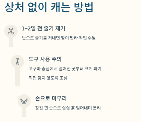 - 도구 사용 주의: 삽이나 쇠딱다기를 사용할 때는 고구마가 박혀 있는 중심부에서 약간 떨어진 곳부터 크게 흙을 들쳐 올려야 합니다. 고구마 몸통에 직접 도구가 닿지 않도록 주의하세요.