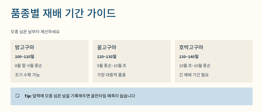 - 밤고구마는 100일, 꿀고구마는 120일, 호박고구마는 130일을 기억하세요.