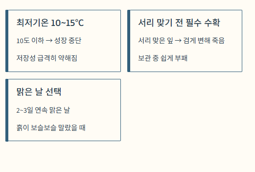 - 수확 후에는 반드시 따뜻한 곳에서 며칠간 말리는 큐어링 과정을 거치세요.