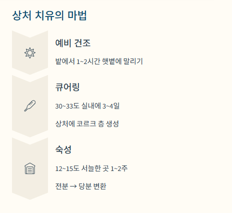 - 큐어링(상처 치유): 수확 중 생긴 미세한 상처를 아물게 하는 과정입니다. 통풍이 잘되고 따뜻한(30~33도) 실내에 3~4일간 두면 상처 부위에 코르크 층이 생겨 썩는 것을 방지합니다. 일반 가정에서는 거실이나 따뜻한 방에 펼쳐두는 것으로 대신할 수 있습니다.