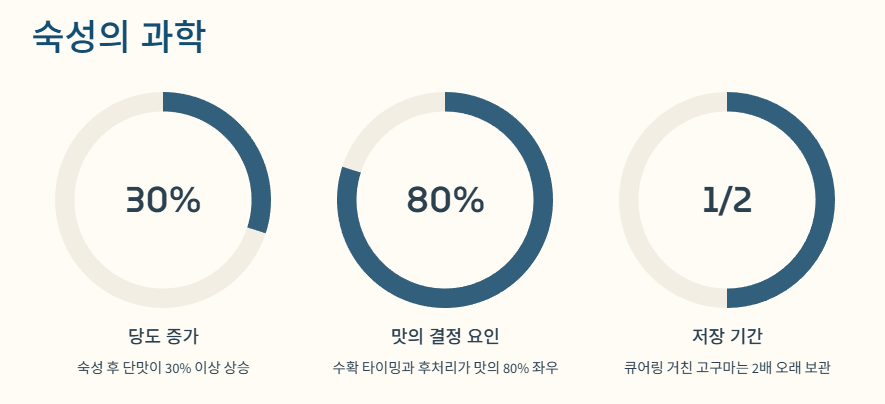 - 숙성 기간: 고구마의 전분이 당분으로 변하는 시간입니다. 수확 후 서늘한 곳(12~15도)에서 1~2주 정도 숙성시킨 뒤 드시면 훨씬 깊은 단맛을 느낄 수 있습니다.