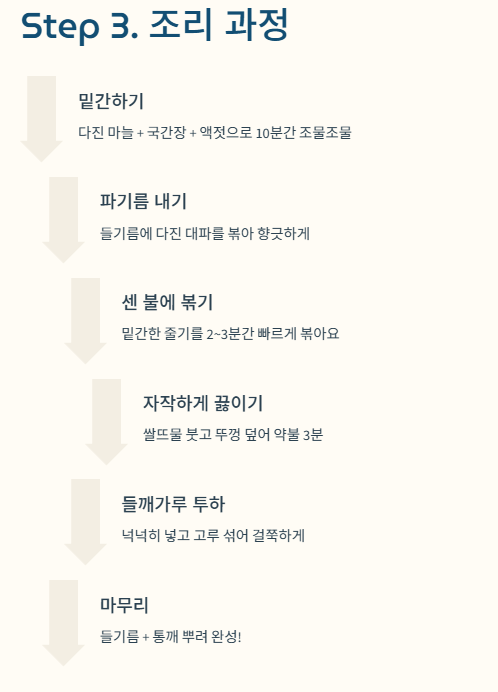 | 기본 양념 | 국간장 2큰술, 멸치액젓 1큰술, 들기름(또는 참기름) 2큰술 |