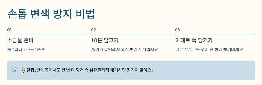 - 손톱 변색 방지 꿀팁: 맨손으로 껍질을 벗기면 손톱 밑이 검게 물듭니다. 이를 방지하려면 **'소금물'**을 활용하세요.