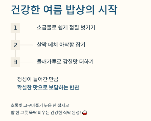 - 장기 보관법: 고구마줄기가 많이 남았다면 삶은 상태에서 물기를 조금 남겨 지퍼백에 넣은 뒤 냉동 보관하세요. 나중에 육개장이나 생선 조림에 넣어 활용하면 좋습니다.