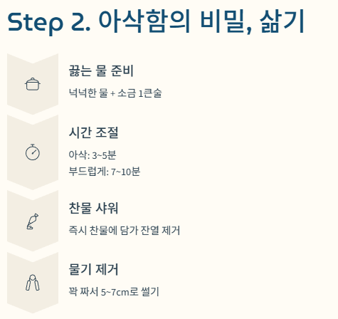 2. 핵심 공정: 아삭함을 결정하는 '삶기' 단계