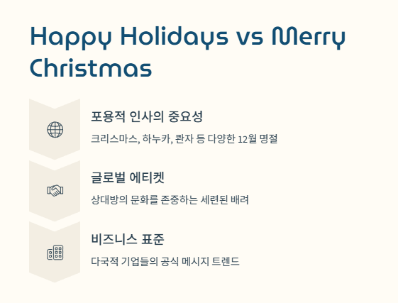 - 비즈니스 에티켓: 글로벌 기업들은 특정 종교색을 드러내지 않기 위해 공식 메시지에서 'Season's Greetings'를 주로 사용합니다.