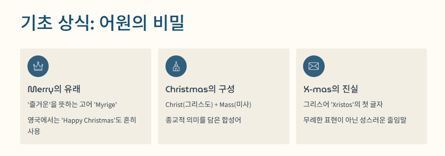 - Christmas의 구성: 'Christ(그리스도)' + 'Mass(미사/예배)'의 합성어입니다.