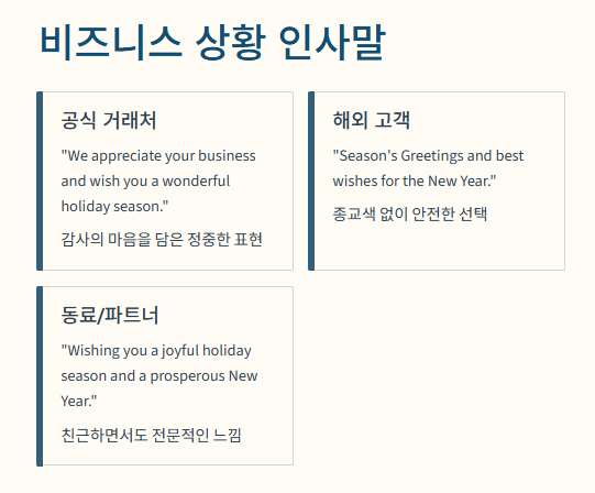 | 일반적인 인사 | Wishing you a Merry Christmas and a Happy New Year! | 가장 표준적이고 실패 없는 인사 |