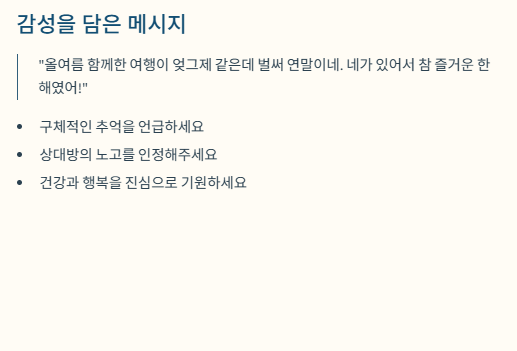 - 추억 강조형: "올여름 우리 같이 여행 갔던 게 엊그제 같은데 벌써 연말이네. 네가 있어서 참 즐거운 한 해였어!"
