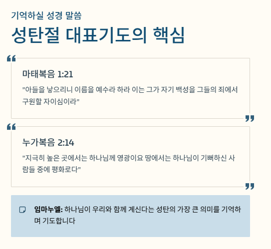 - 성경 구절 인용: 마태복음 1:21(임마누엘), 누가복음 2:14 등의 성탄 관련 말씀을 기도 문구에 녹여내면 더욱 깊이 있는 기도가 됩니다.
