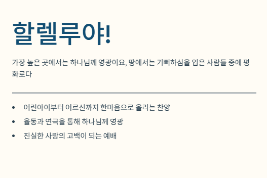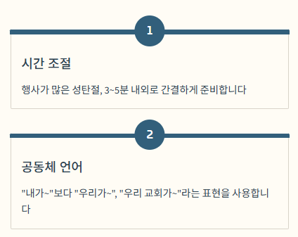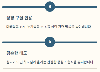 - 시간 조절: 성탄절은 행사와 순서가 많으므로 평소보다 조금 더 간결하게 준비하는 것이 좋습니다. (보통 3~5분 내외)