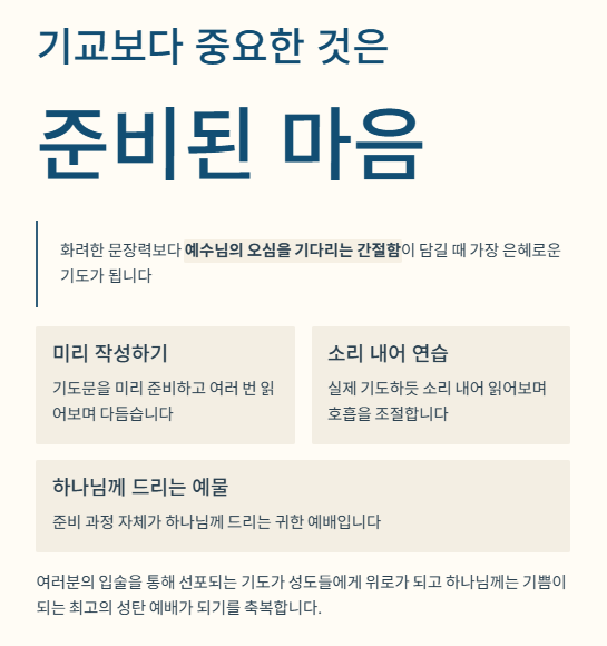 - 우리(We)라는 표현: "내가~" 보다는 "우리가~", "우리 교회가~"라는 표현을 사용하여 공동체의 기도임을 명시합니다.