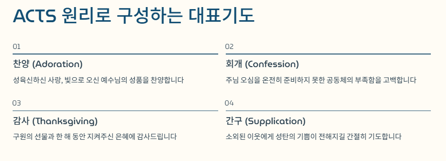 대표기도는 개인의 기도가 아닌 공동체의 고백입니다. 아래의 구조를 따르면 훨씬 논리적이고 은혜로운 기도를 작성할 수 있습니다.