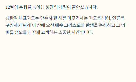 "교회의 가장 큰 축제 중 하나인 성탄절, 회중을 대표하여 기도의 자리에 선다는 것은 큰 영광인 동시에 떨리는 일입니다. 화려한 수식어보다 중요한 것은 '낮은 곳으로 임하신 예수님의 마음'을 담아내는 것입니다."