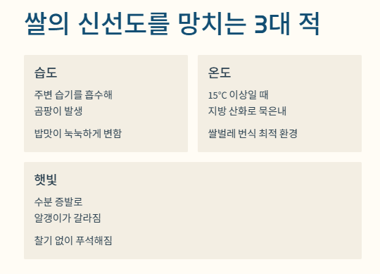 쌀은 온도와 습도에 매우 민감한 작물입니다. 아래 세 가지 요소를 차단하는 것이 보관의 핵심입니다.