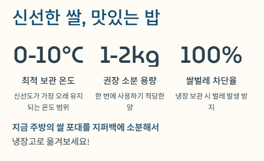 | 지퍼백/밀폐용기 냉장 | 최상의 밥맛 유지, 벌레 100% 차단 | 냉장고 공간 차지 | ⭐⭐⭐⭐⭐ |