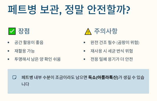 | 페트병(PET) 보관 | 재활용 가능, 공간 활용 좋음 | 입구가 좁아 세척 및 건조가 어려움 (위생 주의) | ⭐⭐⭐ |