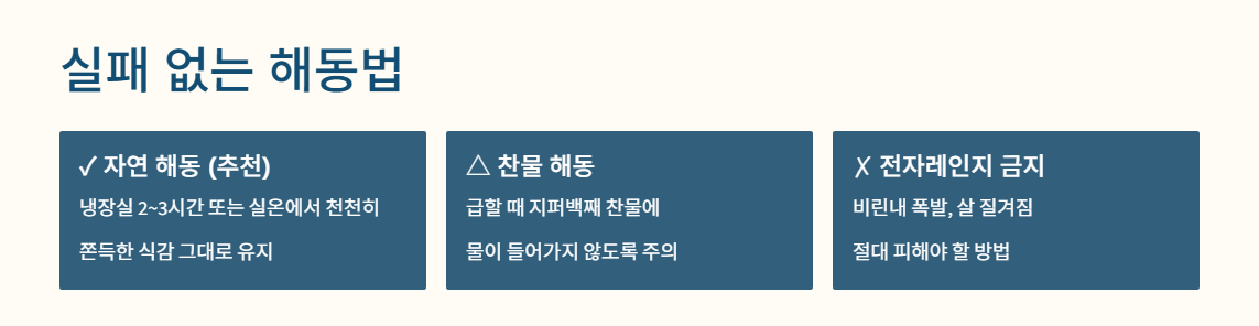 - 자연 해동 (추천): 먹기 2~3시간 전에 냉장실로 옮겨 천천히 해동하거나, 실온에서 서서히 녹입니다. 그래야 살이 퍼지지 않고 쫀득함이 살아납니다.