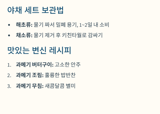 - 해초류(미역, 곰피): 물기를 꽉 짜서 밀폐 용기에 담아 냉장 보관하되, 가급적 1~2일 내에 소비하세요.