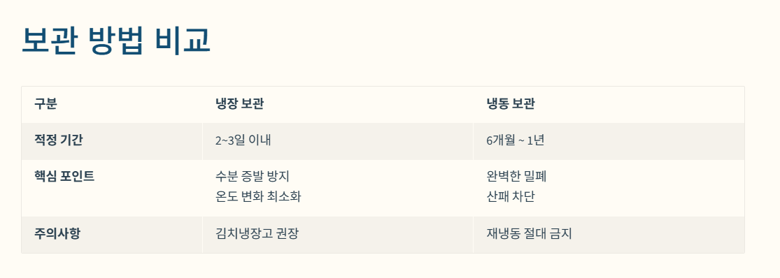 | 주의사항 | 김치냉장고가 일반 냉장고보다 유리 | 해동 후 재냉동 절대 금지 |