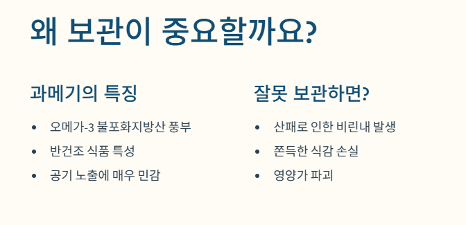 과메기는 오메가-3와 같은 불포화지방산이 풍부합니다. 이는 몸에는 좋지만, **산소와 결합하면 산패(기름이 상하는 현상)**가 매우 빠르게 일어납니다.