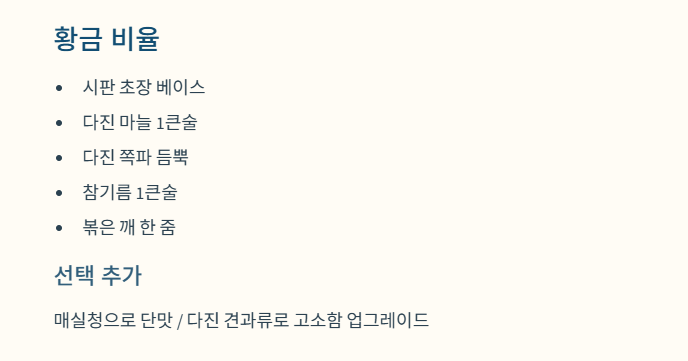 - 황금 비율 레시피: 시판 초장에 다진 마늘 1큰술, 다진 쪽파, 참기름 1큰술, 볶은 깨를 듬뿍 넣어보세요.
